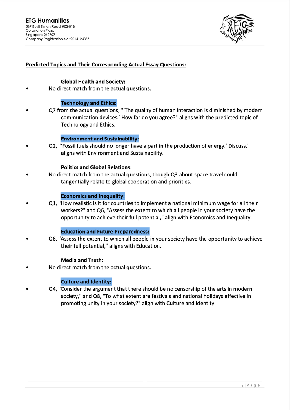 These themes – environment, science and technology, and globalisation – have become perennial favourites, consistently appearing in the A-Level General Paper exams year after year. Why choose ETG? Having consistently anticipated the evolving nature of GP A Level themes, we possess a deep understanding that empowers us to effectively predict most essay questions.